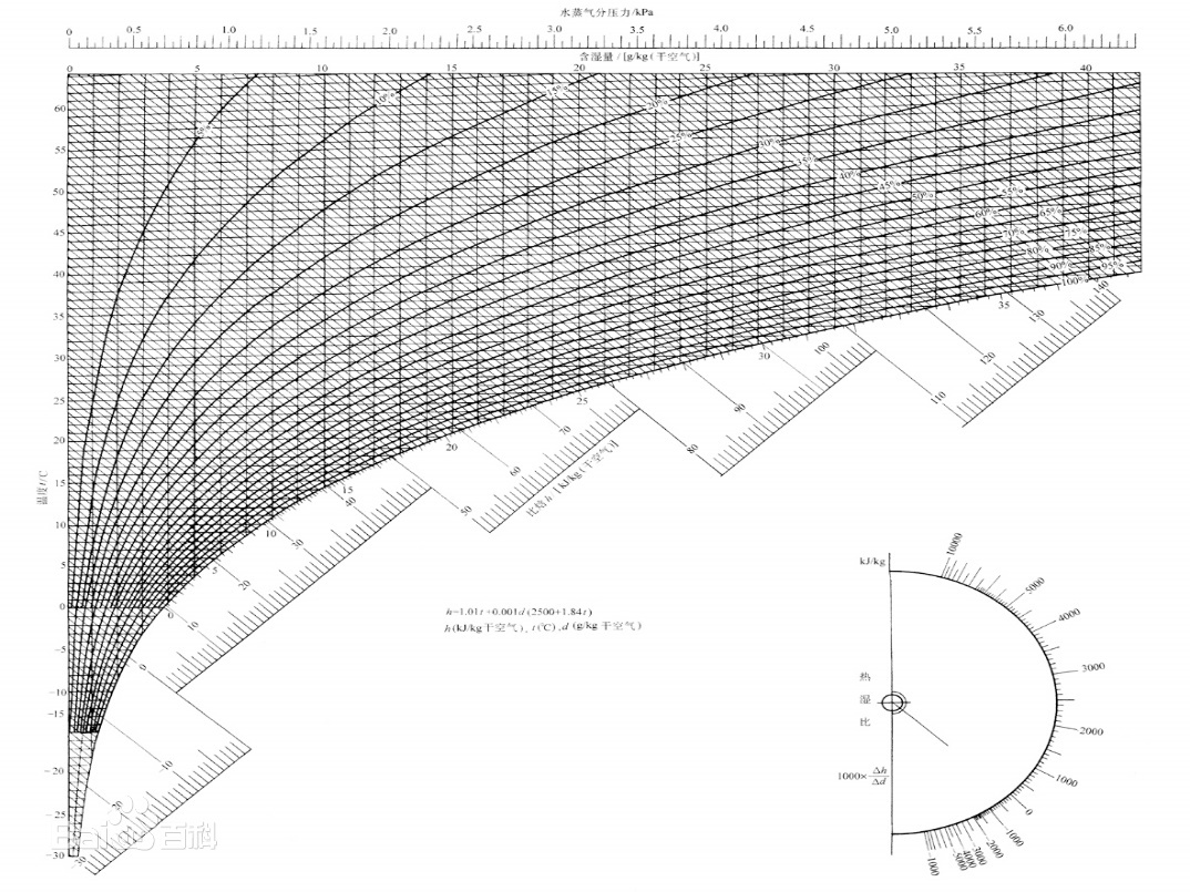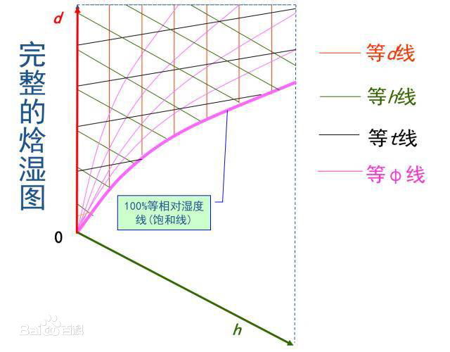 下圖為濕空氣焓濕圖(部分)的示意圖(圖片來源百度百科)   該圖是以1kg干空氣的濕空氣為基準繪制的。不同大氣壓的焓濕圖是不同的。焓濕圖上有幾種等值參數線:等焓(h)線—與縱坐標成135°角的直線;等含濕量(d)線—平行縱坐標軸的直線;等干球溫度(t)線—近似水平的直線;等相對濕度(Ø)線—圖中的曲線;等濕球溫度線近似與等焓線平行,圖中未表示;水蒸氣分壓力(pw)與d成單值函數關系,其值表示于d的上方,等pw線平行于等d線;圖的右下方給出了熱濕比ε的方向線,熱濕比又稱角系數。