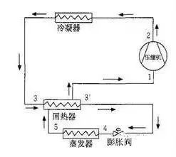 同時(shí)也加熱了回氣管的溫度,避免壓縮機(jī)吸入過潮蒸汽而可能產(chǎn)生液擊。毛細(xì)管節(jié)流的系統(tǒng),毛細(xì)管與回氣管(吸氣管)合并在一起走,有合焊在一起的(大金VRV就是采用的此種方法),有用熱膠套套在一起的,有從回氣管中穿過的,還有纏繞在回氣管上的,也有的將毛細(xì)管或供液管直接在箱體內(nèi)通過。毛細(xì)管與回氣管進(jìn)行熱交換,使節(jié)流前的液態(tài)制冷劑與回氣管道中的低溫制冷劑蒸汽進(jìn)行熱交換冷卻而得到過冷,這樣既可減少回氣管路中可能夾帶的液體液擊壓縮機(jī),同時(shí)又能達(dá)到節(jié)流前液體制冷劑過冷的目的。當(dāng)然還有采用回?zé)崞鞯模硪彩且粯樱垍⒁娤聢D: