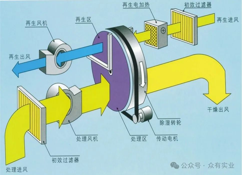 轉輪除濕機通常有兩個風路:處理風(干空氣)和再生風(濕空氣)。處理風是需要被除濕的空氣,再生風是用于再生吸濕輪的空氣。