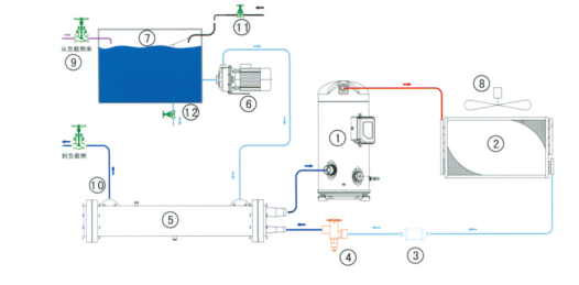 1、壓縮機(jī) 2、殼管式冷凝器 3、干燥過濾器 4、熱力膨脹閥 5、干式蒸發(fā)器 6、不銹鋼水泵 7、水箱